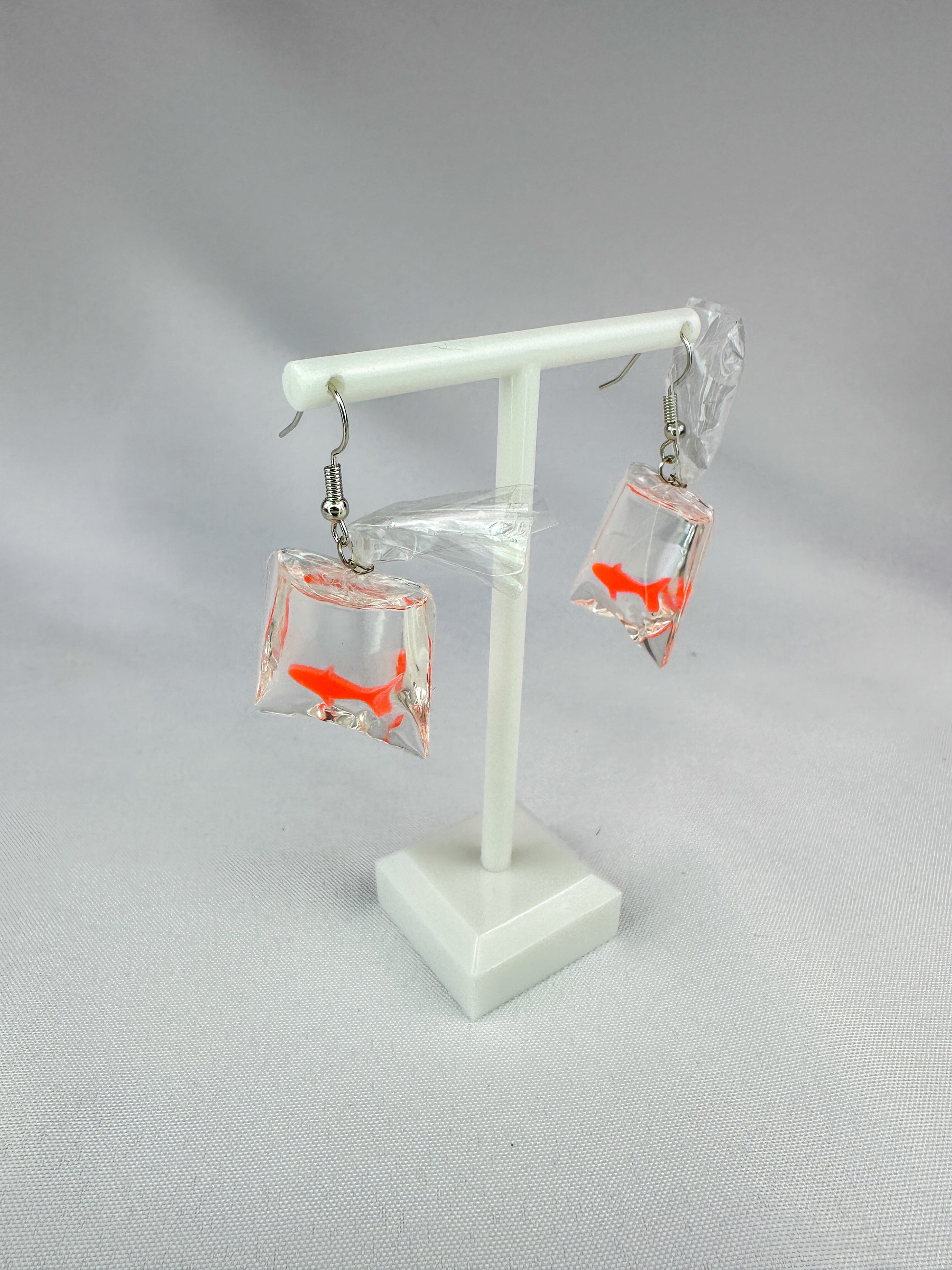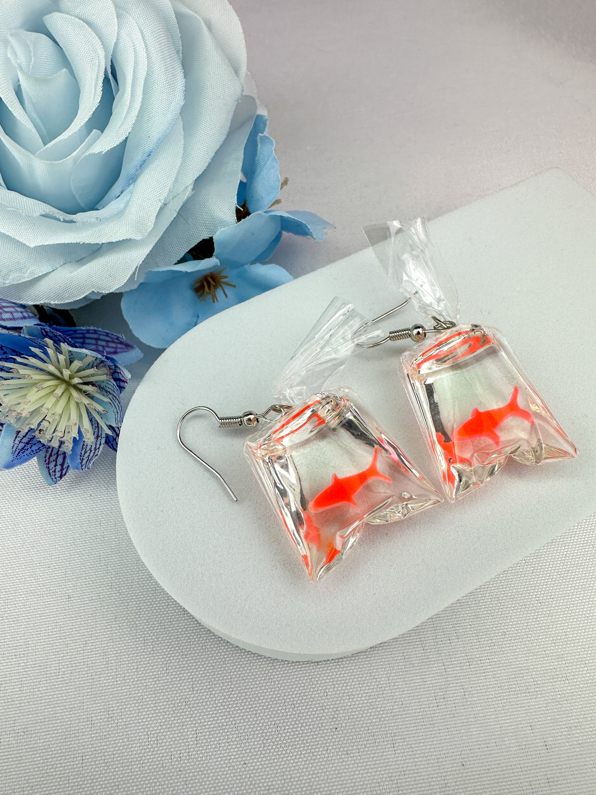 Goldfish are one of the most studied pet fish, known for their ability to recognize faces and even learn tricks! These whimsical dangle earrings mimic the classic pet-store bag but with a scientifically stylish twist.