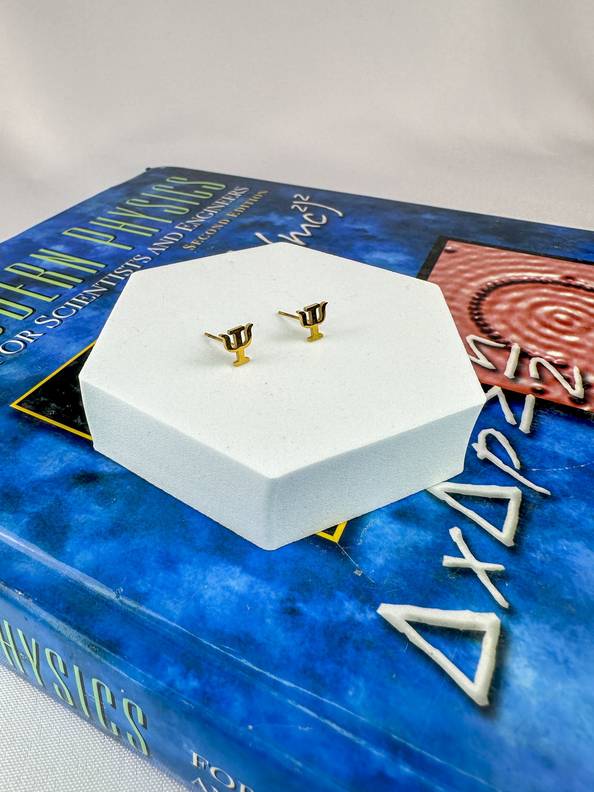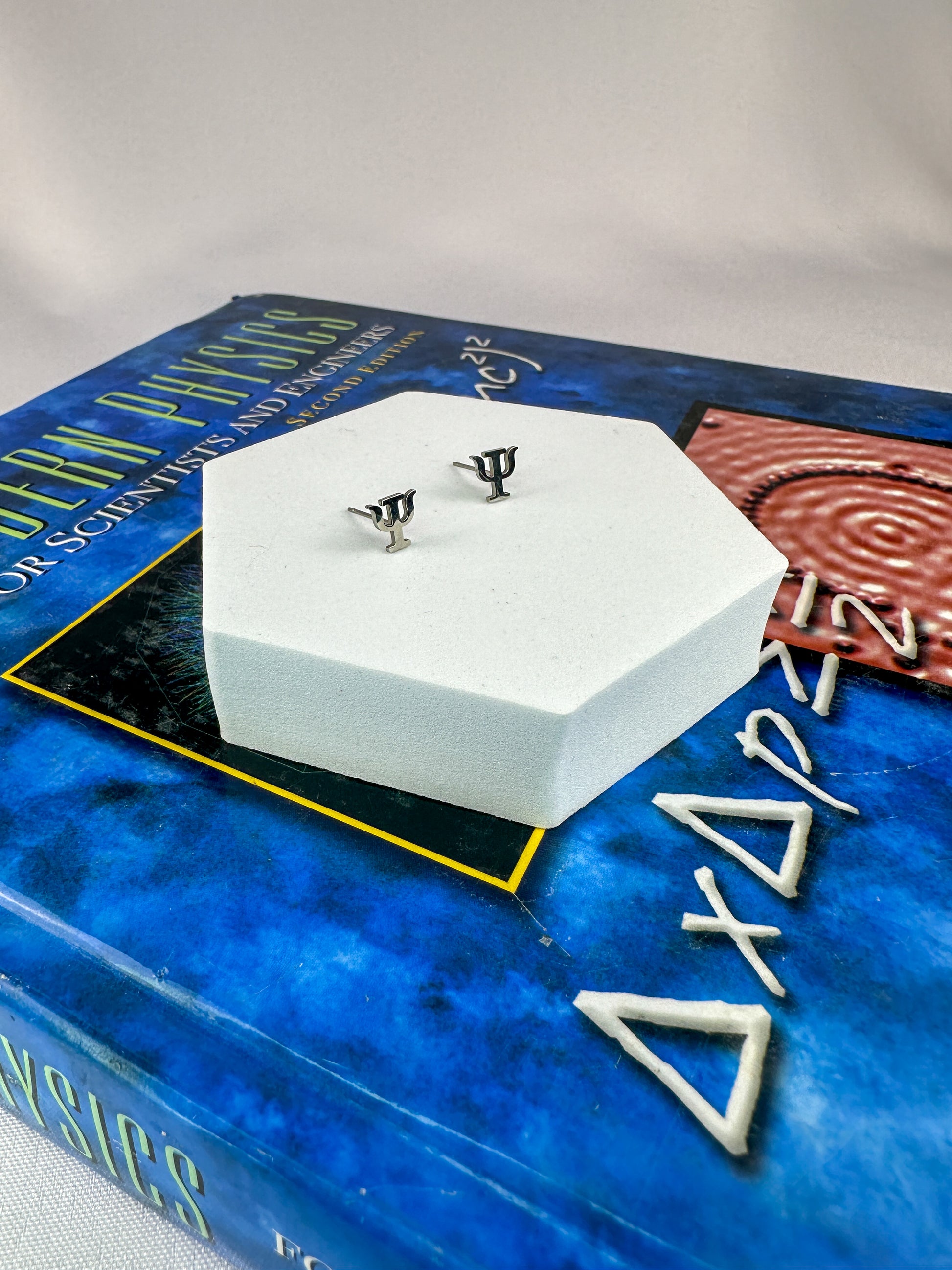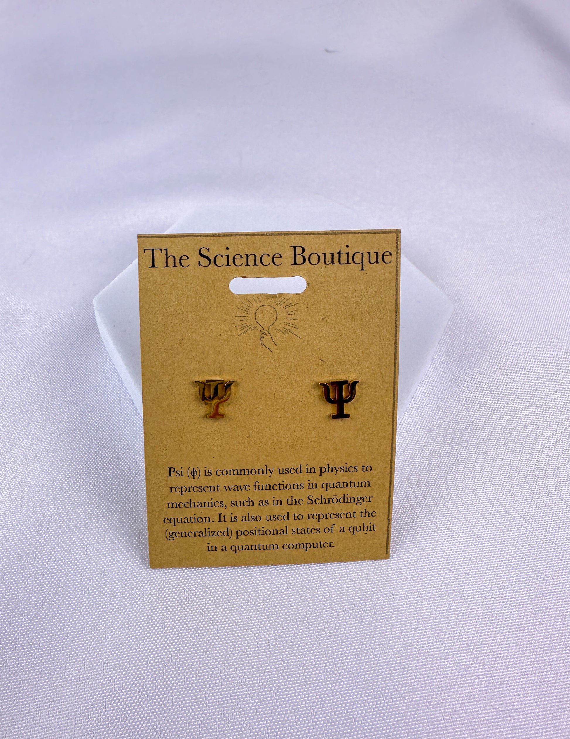 Psi (Ψ) is the symbol for the wavefunction in quantum mechanics, describing the probability of particles existing in different states. These minimalist studs are perfect for physics lovers, quantum researchers, and anyone fascinated by the mysteries of the universe.