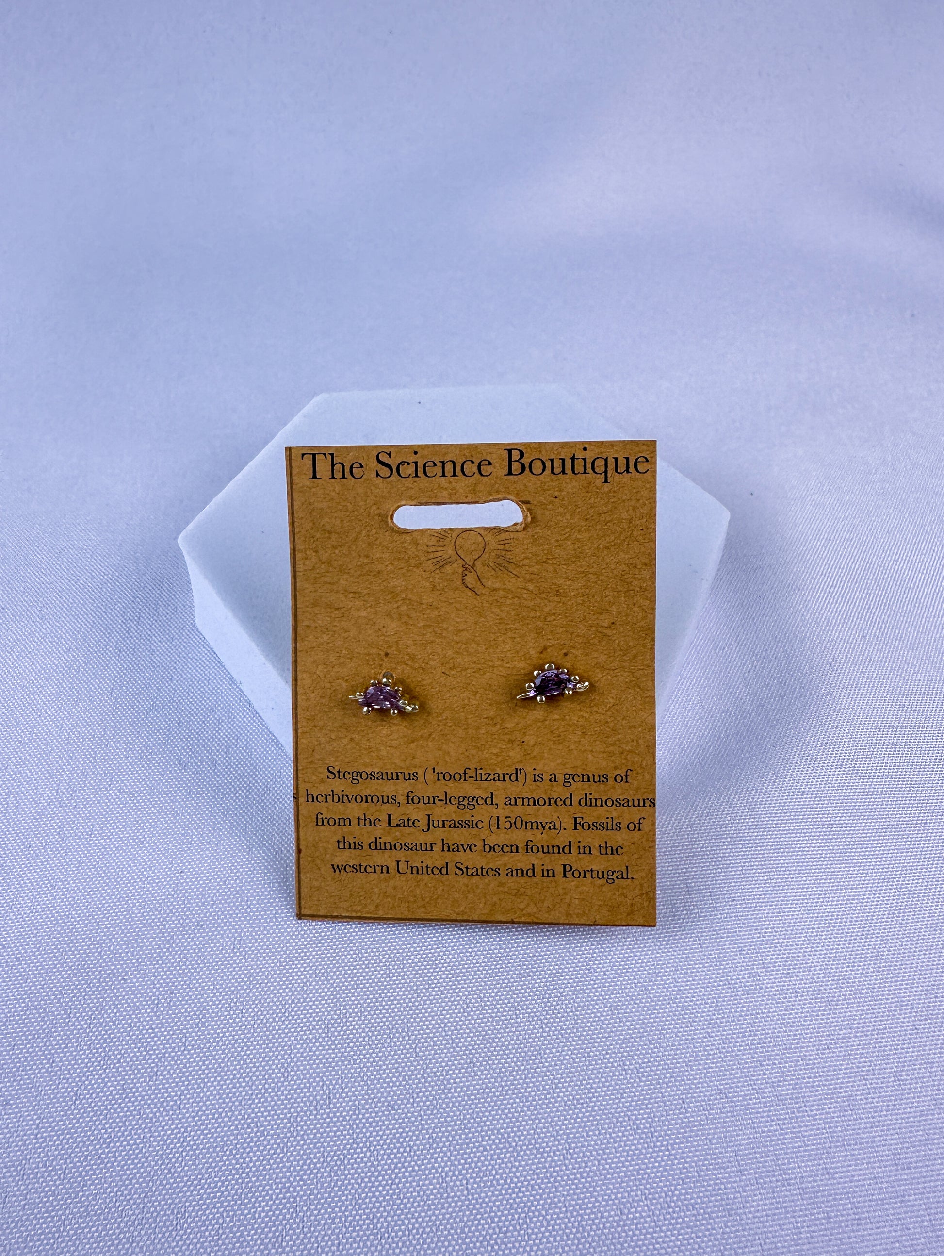 Stegosaurus is famous for its unique back plates and tail spikes, used for defense and possibly thermoregulation. These purple gemstone studs celebrate this armored giant of the Jurassic!